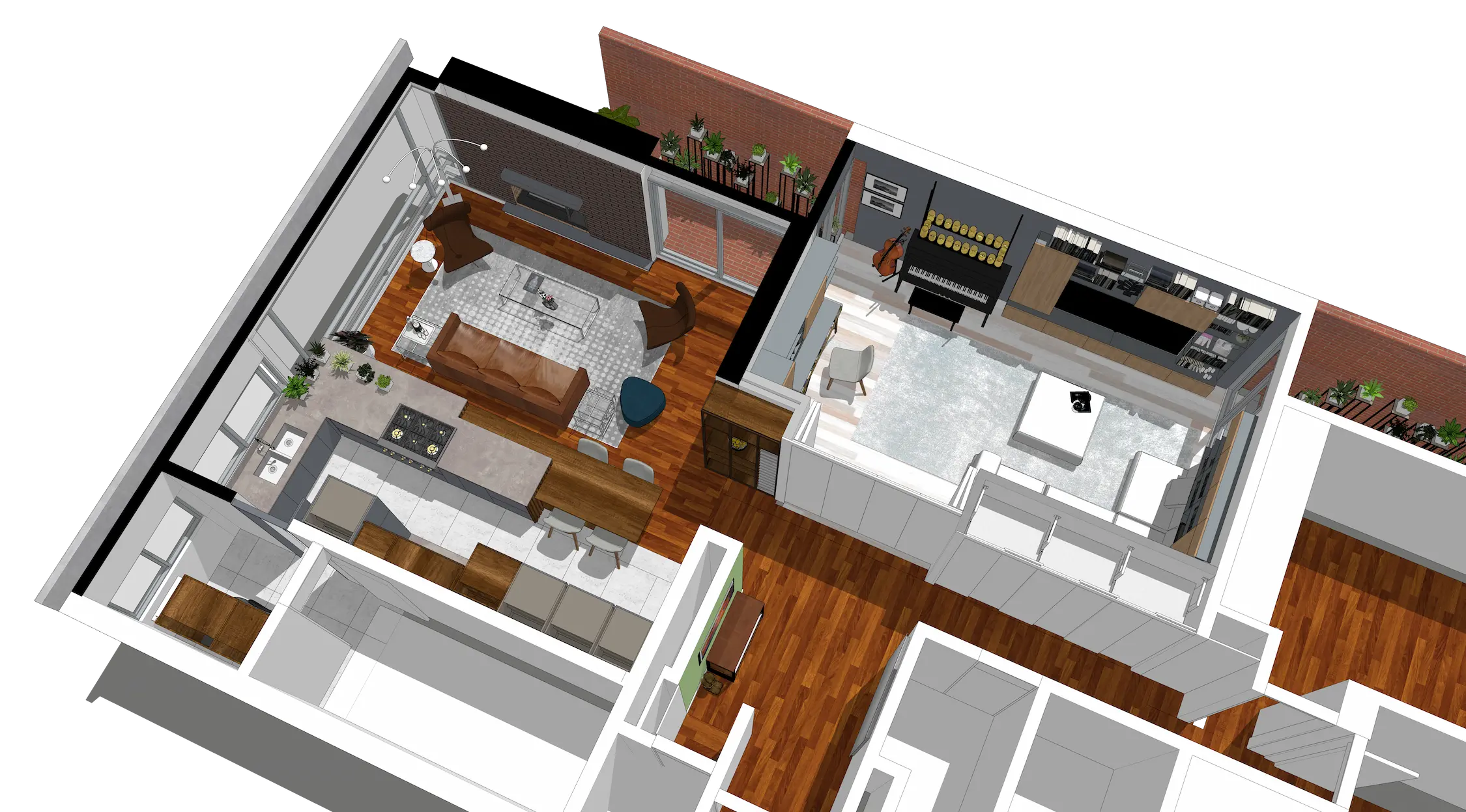 Optimizamos la zona social, destacando la cocina como protagonista. Implementamos un diseño de iluminación contemporáneo y actualizamos los acabados para lograr un ambiente moderno y funcional. En PDL 90 el estudio estuvo a cargo del diseño interior y el seguimiento de obra.